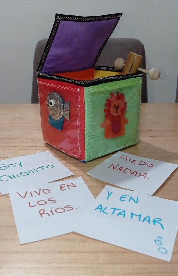 Contiene 5 bolsillos transparentes para colocarles adivinanzas, pistas, imágenes, poesías.